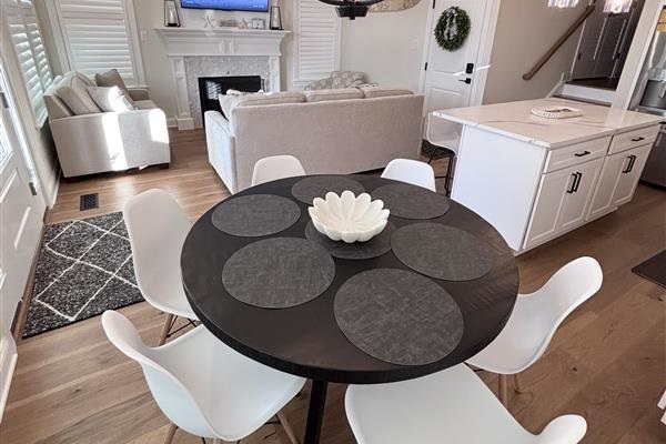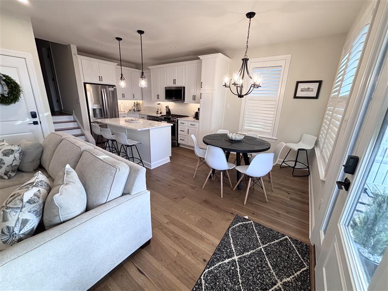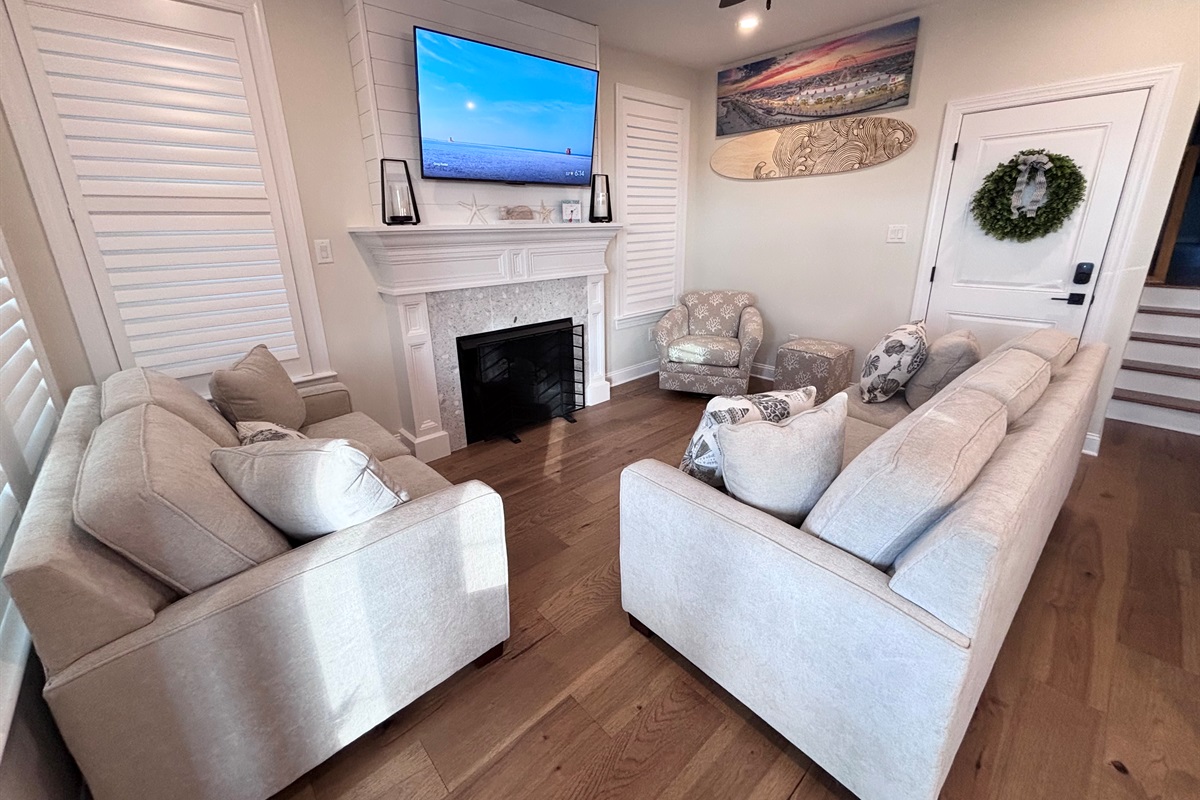 Step inside to an open-concept living space that feels bright and welcoming from the moment you arrive. The kitchen serves as the heart of the home, featuring high-end cabinetry, updated stainless steel appliances, stone countertops, and a tile backsplash that adds both texture and sophistication. Whether you’re preparing a casual breakfast or a special family dinner, this space flows seamlessly into the dining and living areas—perfect for gathering and entertaining. The living room is warm and inviting, anchored by a gas fireplace that creates a cozy atmosphere year-round. Hardwood flooring runs throughout the home, enhancing the clean, coastal aesthetic and providing a polished, cohesive look from room to room. This condo offers three spacious bedrooms and two full bathrooms, each thoughtfully finished with tiled showers and baths, elevated vanities, and quality fixtures. Natural light pours in through tilt-in windows, enhancing the airy feel throughout the home.