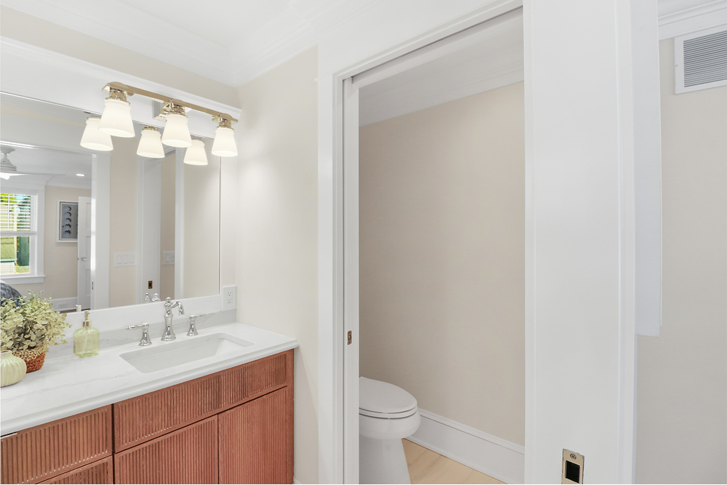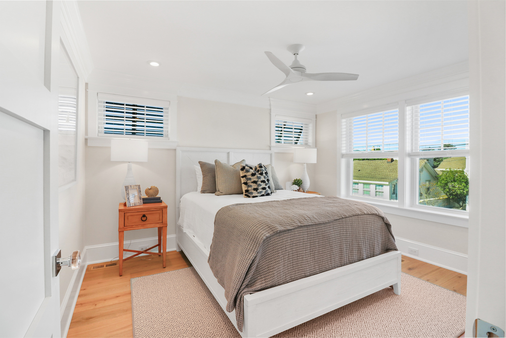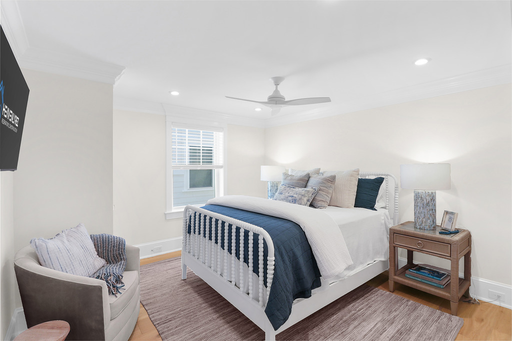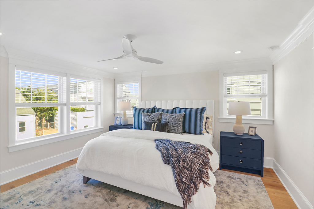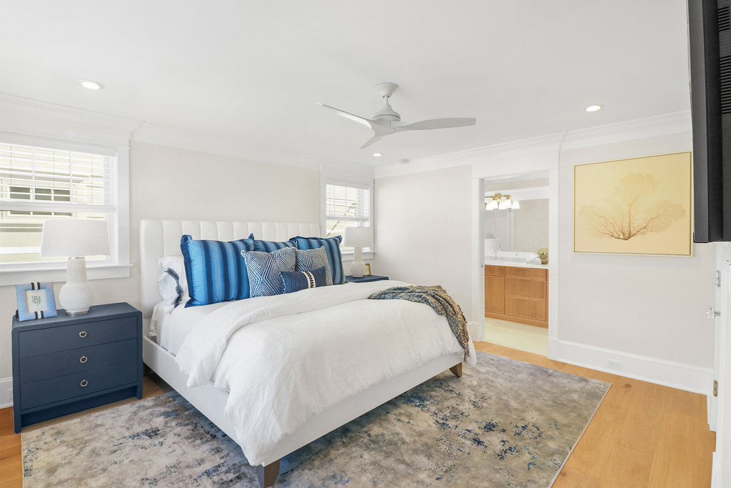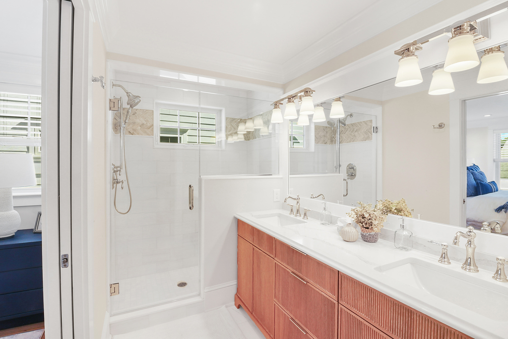 With six bedrooms and three full bathrooms, there’s space for everyone—whether it’s a sprawling family gathering or friends sharing a summer escape. The primary suite feels like a private spa, with a custom tile shower, double vanities, and serene design.