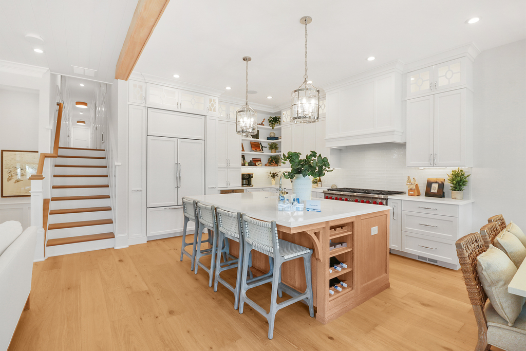 The gourmet kitchen is the showstopper: a massive quartz island built for conversations and cocktails, Sub-Zero refrigerator, Wolf stove, and custom cabinetry that blends craftsmanship with function. Just off the kitchen, a wet bar with wine fridge and storage keeps entertaining effortless. Picture evenings where laughter spills from the dining table, the gas fireplace glows softly, and the covered porch offers a breezy perch for watching the neighborhood come alive.