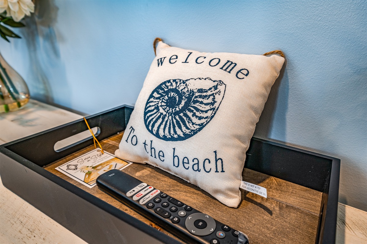 Welcome materials (property welcome book, welcome card, and pen)
