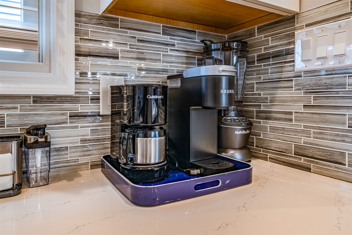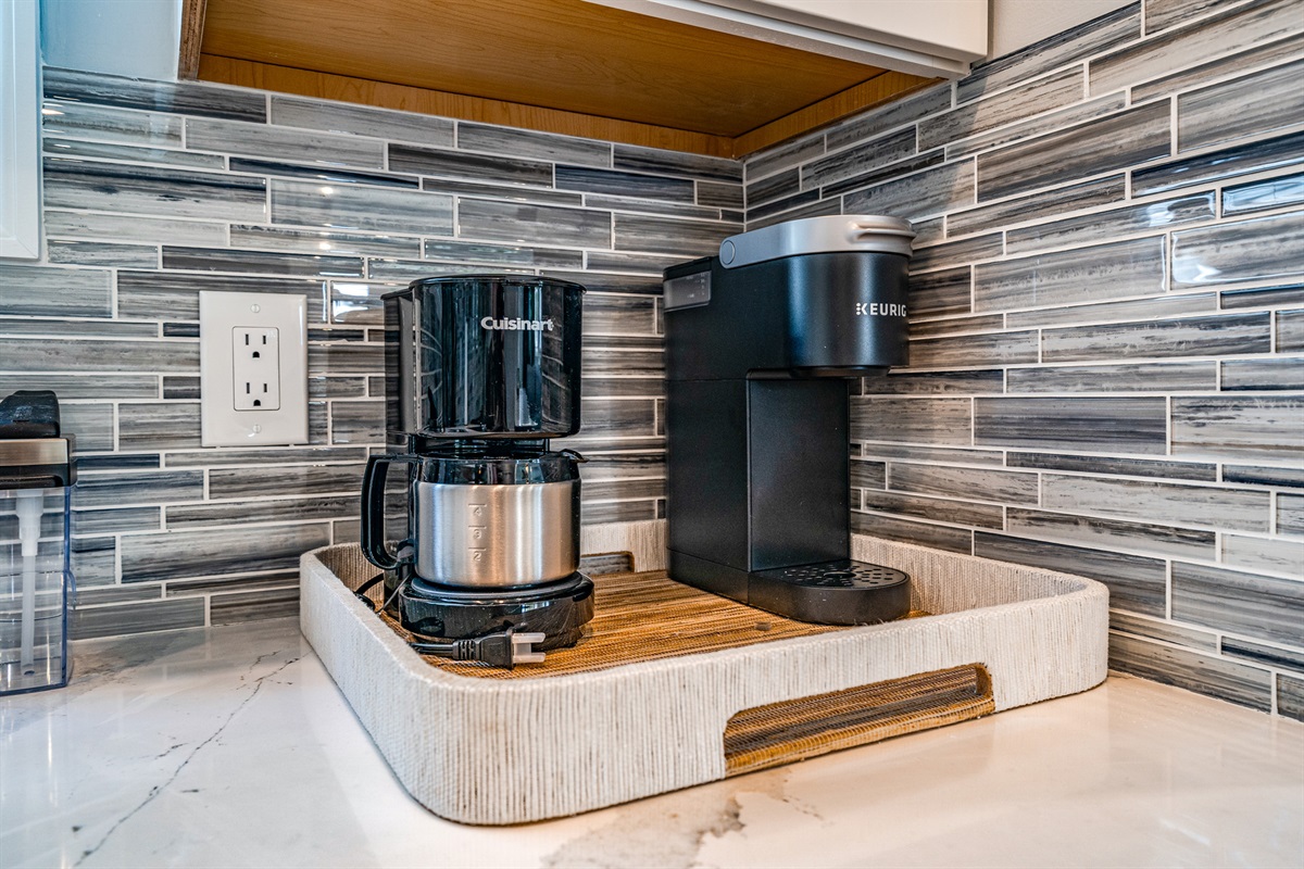 Coffee essentials (coffee pods, sugar, creamer, and stirrers)