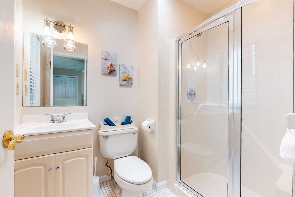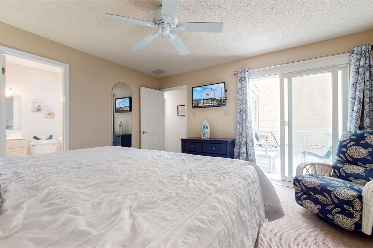 The condo features three inviting bedrooms a serene king suite with a private rear deck, a queen room, and a third bedroom with a queen and twin bed for flexible sleeping arrangements. The modern bathrooms include fresh linens, hair dryers, and all the essentials to make your stay effortless.
