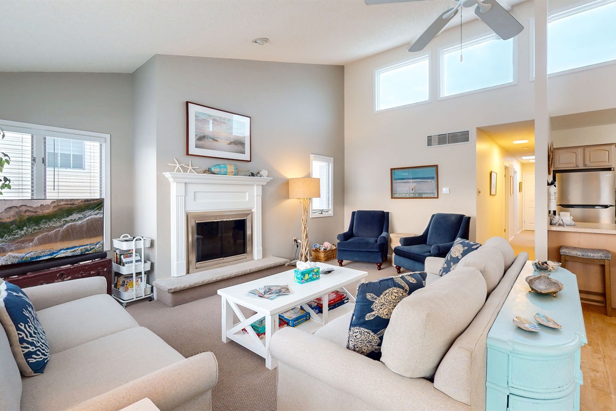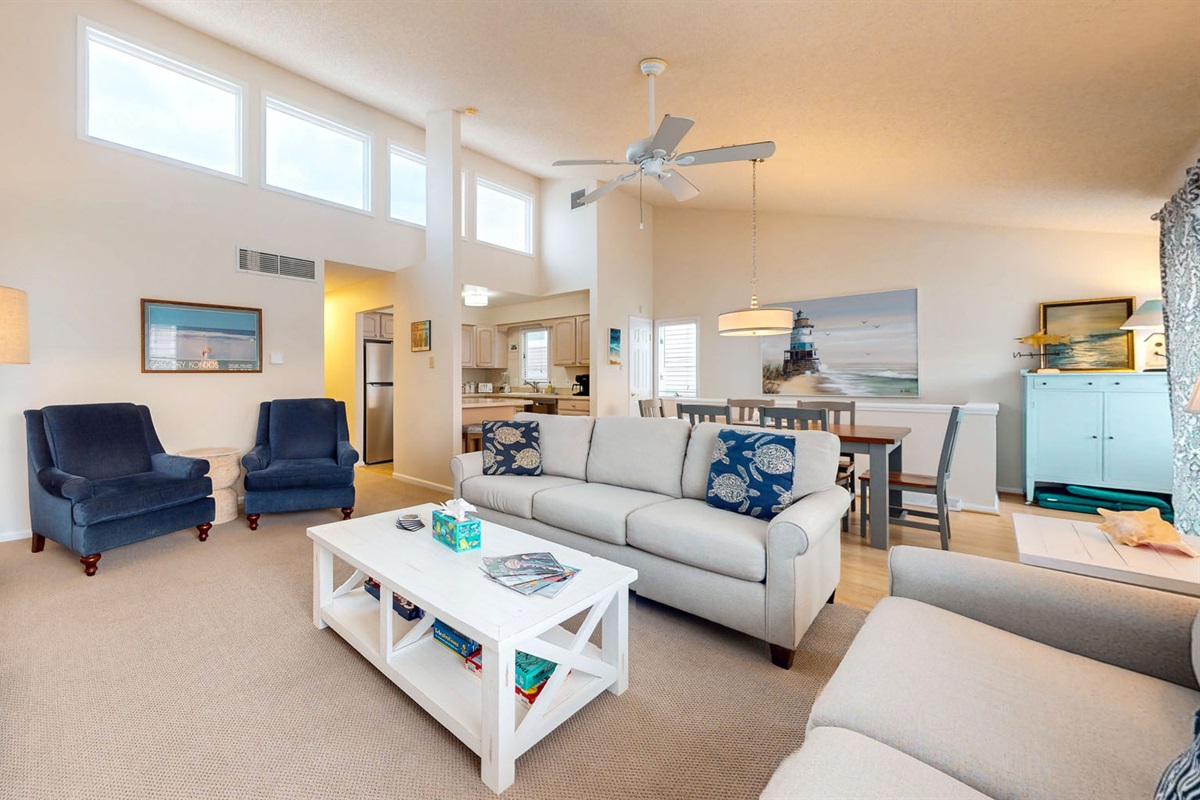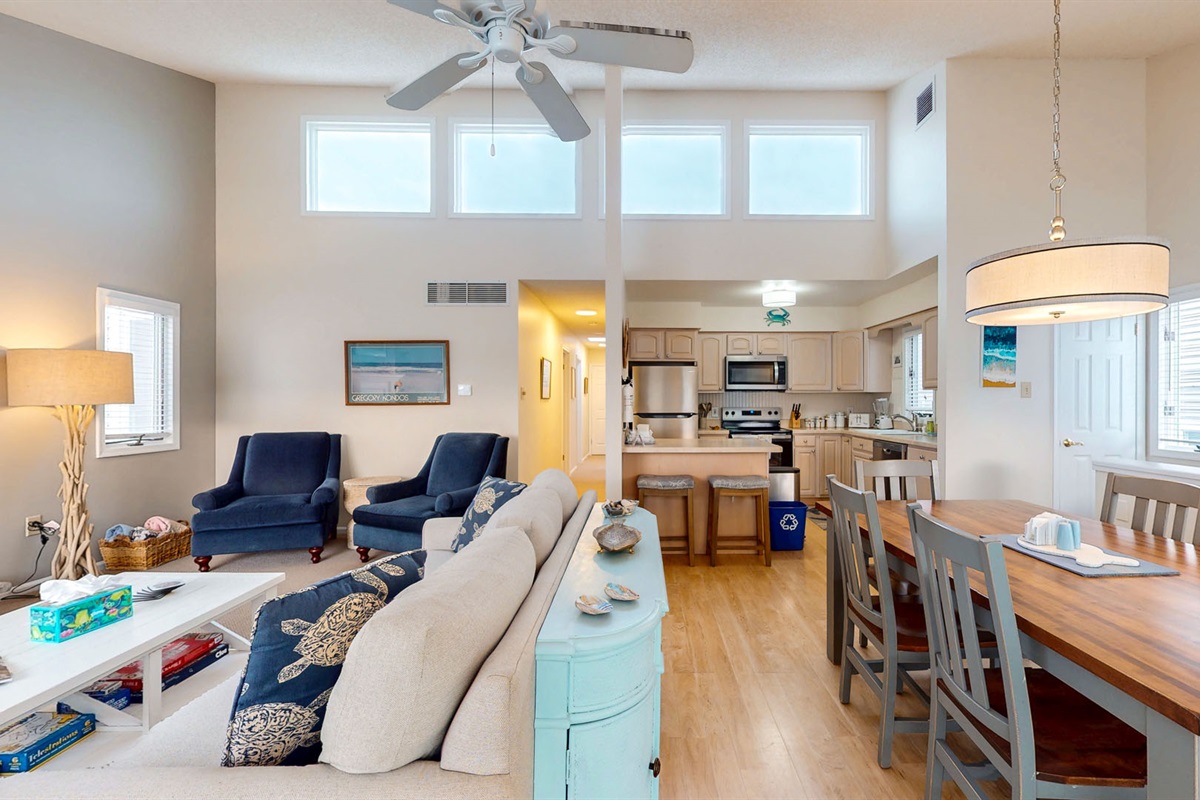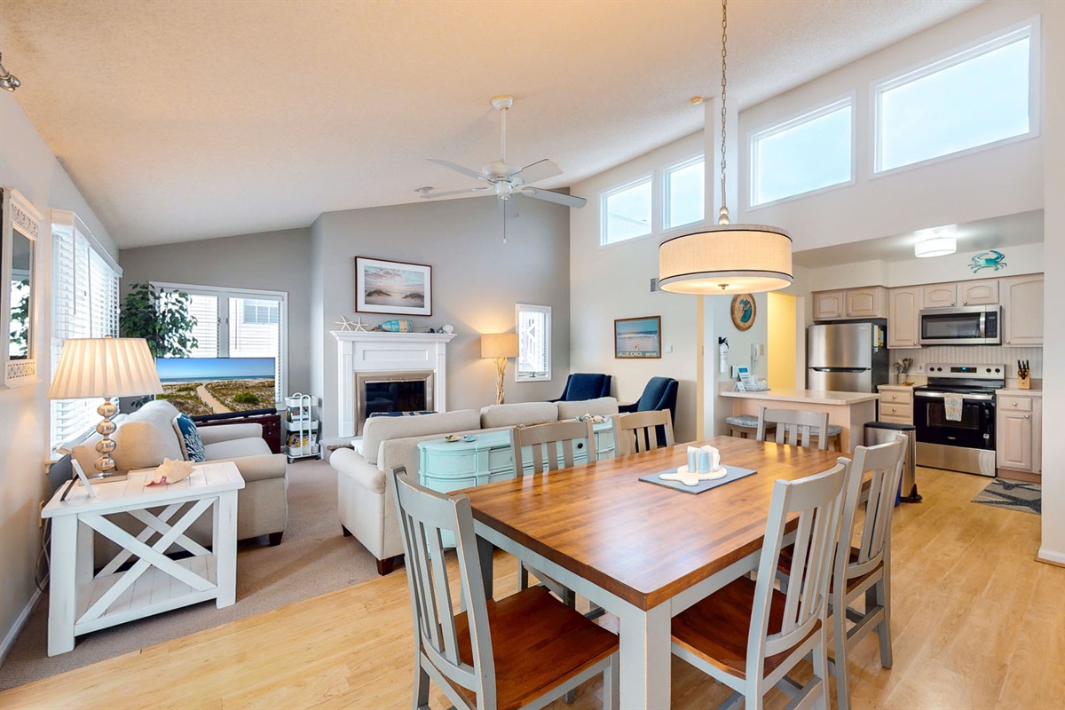Inside, an open-concept living area with high ceilings and expansive windows fills the space with natural light. Gather for board games from the well-stocked game cabinet, share meals around the dining table, or cozy up by the fireplace after a day in the sun. The kitchen and dining areas are perfect for entertaining, whether it’s breakfast with the family or a relaxed evening with friends.