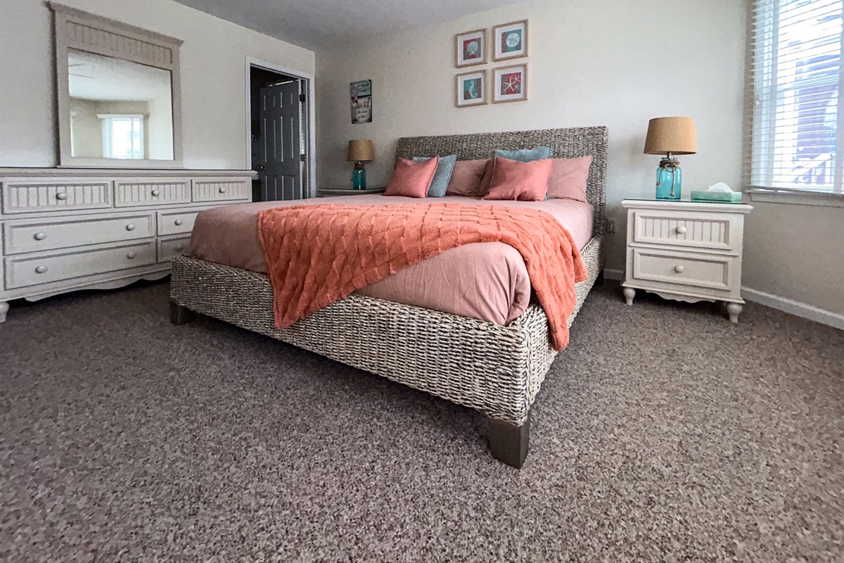 Each bedroom offers its own sense of comfort: a cozy queen retreat just off the foyer, a fun pyramid bunk room for kids or teens, a light-filled twin room, and a private primary suite at the end of the hall with its own full bath. The convenience of a walk-in laundry room means sandy towels and bathing suits never pile up.